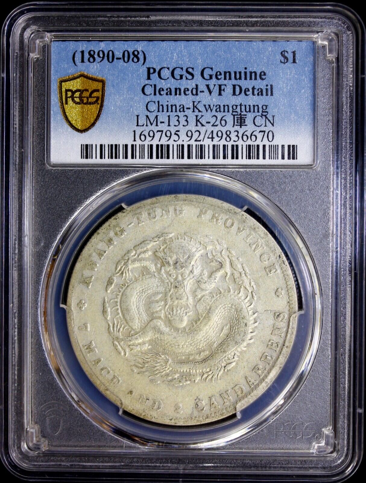 (1890-08) CHINA Kwangtung Silver Dollar LM-133 K-26 庫 CN. PCGS VF Detail